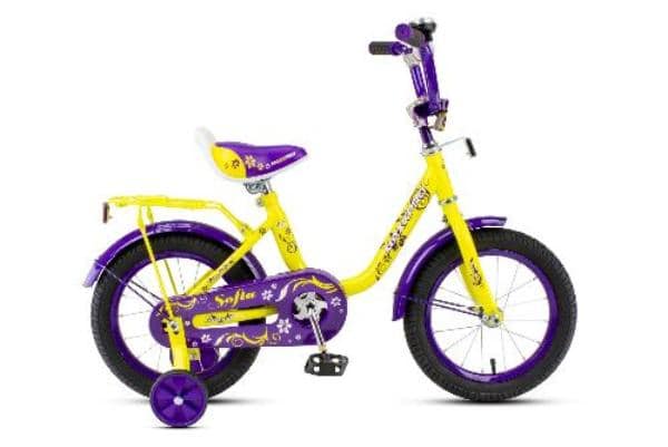 Детский MaxxPro Sofia 14 из обновленной линейки 2020 года станет отличным вариантом первого велосипеда для девочек от 3 до 5 лет. Яркий современный дизайн в желтом цвете и контрастными фиолетовыми деталями привлекает внимание и обязательно понравится детям. Конструкция рамы специально выполнена для девочек, позволяя без дискомфорта садиться на велосипед и слезать с него, не задирая ноги слишком высоко. Качественные материалы и продуманные мелочи порадуют во время катания. В комплекте идут дополнительные боковые колеса, который можно снять, как только ребенок научиться самостоятельно держать равновесие. Рама выполнена из стального сплава, который обладает оптимальной прочностью при сохранении небольшого веса. Мягкое и широкое седло подарит ребенку комфорт на протяжение всего времени катания. Руль с прорезиненными ручками обеспечит безопасный хват и точность в управлении. Дополнительная мягкая накладка по центру исключает возможность случайно удариться об руль во время торможения. Седло и руль регулируются по высоте. Благодаря этому, Вам не придется менять велосипед каждый новый сезон. Металлическая защита цепи защищает ноги от случайных травм и исключает возможность попадания брюк в механизм. Велосипед оснащен задним багажником для перевозки необходимых мелочей во время прогулки. Полноразмерные стальные крылья защитят от грязи и брызг в непогоду. Громкий звонок на руле поможет ребенку подать звуковой сигнал при необходимости и привлечет окружающих.Особенности и преимущества: